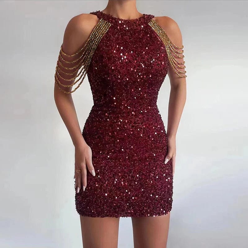 Olśniewająca Cekinowa Sukienka Mini Z Paskami Na Ramionach od sklepu Faylise to must-have dla każdej kobiety, która pragnie błyszczeć na wyjątkowych okazjach! Wykonana z wysokiej jakości materiałów, idealnie podkreśla sylwetkę, a cekinowe zdobienia dodają jej niepowtarzalnego uroku. Dzięki eleganckiemu fasonowi A-line i ozdobnym łańcuszkom na ramionach, ta sukienka łączy w sobie komfort i styl.