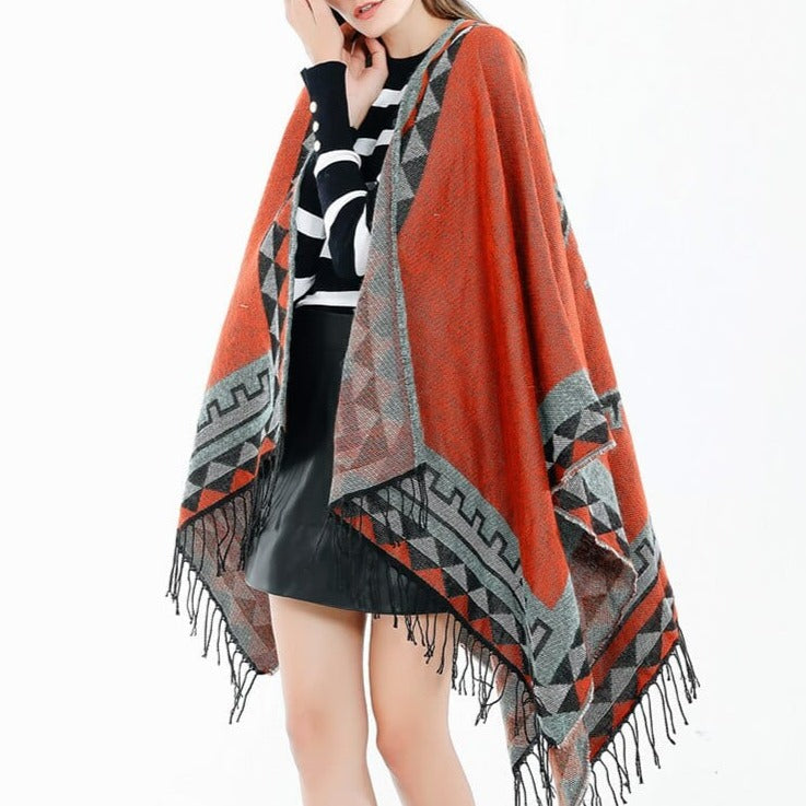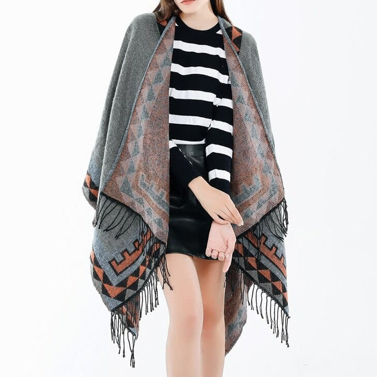 Rozświetl swoją garderobę z Sweterem Ponczo Z Azteckimi Wzorami dostępnym w sklepie Faylise! Ten unikalny sweter nie tylko zapewnia ciepło w chłodniejsze dni, ale również dodaje charakteru każdej stylizacji dzięki swoim nietypowym wzorom i ozdobnym frędzlom.